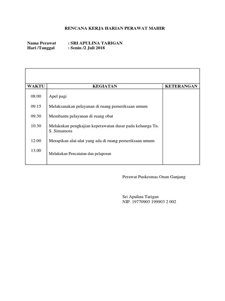 Menyusun rencana kegiatan individu perawat;. Kegiatan harian / uraian tugas. Sampel yang diambil adalah seluruh aktivitas yang dilakukan oleh perawat pelaksana di rawat inap puskesmas seperti kegiatan keperawatan langsung, kegiatan . Uraian kegiatan tugas jabatan fungsional perawat kategori keterampilan sesuai jenjang jabatan, ditetapkan dalam butir kegiatan sebagai berikut:. 3 laporan bulanan pelayanan keperawatan jabatan fungsional perawat ahli n a m a.